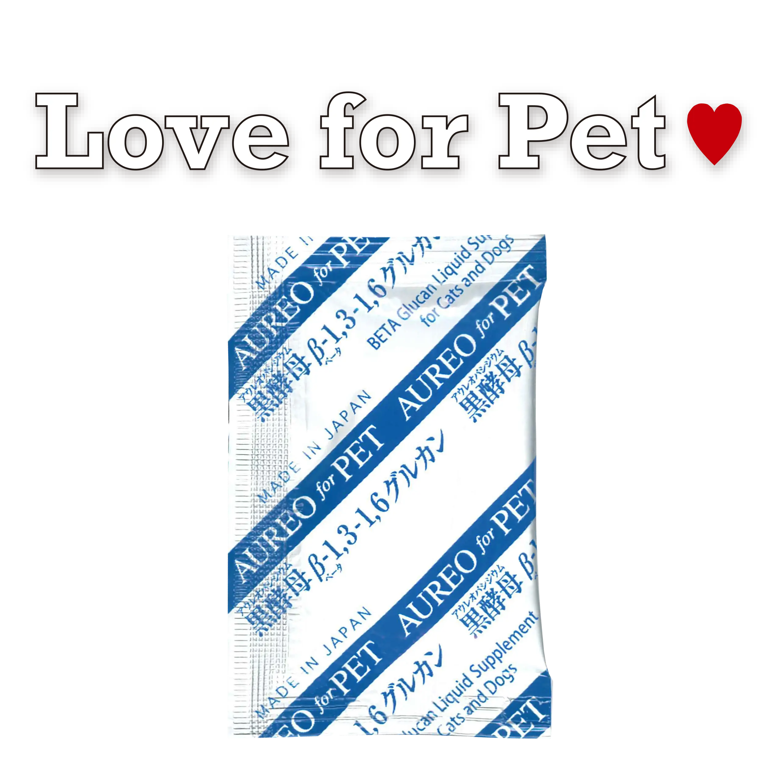 Love for PetアウレオフォーペットLove for PetアウレオフォーペットLove for Petアウレオフォーペット 大切なペットの毎日カンタン健康習慣”ちょっぴりサイズ”だから始めやすい!!「ウチの子食べるか心配…」そんな初めてβ-グルカンを試す子にもおすすめです。 ※どちらのパッケージも内容と入り数は同じです。 黒酵母β‒グルカン含有量 与え方 そのままとろりん おやつかフードに混ぜて 1日の目安量 最初はどのくらいの量からスタートすれば良いのか、 目安量をご参考になさってください。 健康をサポートする食品なので、与える量に決まった制限はありません。 「元気がないからいつもより多めにあげてみよう」など日々の体調をみながら、ペットの様子に合わせて食べさせてください。 Love for Pet 内容量:75mL (5mL×15 袋) お取り扱いクリニック 商品名 Love for Pet (ラブフォーペット) 用途 小動物用健康補助食品 原材料名 黒酵母(アウレオバシジウム)培養液、乳酸 内容量 75mL (5mL×15袋) 与え方 体重10kgあたり1日1~3袋を目安に、そのまま又は食べ物に混ぜて与えてください。 原産国 日本 関連商品 Aureo EF for Pet アウレオ イーエフ ペット 詳細はこちら Aureo for Pet アウレオフォーペット 詳細はこちら Love for Pet ラブフォーペット 詳細はこちら Love for Pet SPECIAL ラブフォーペットスペシャル 詳細はこちら